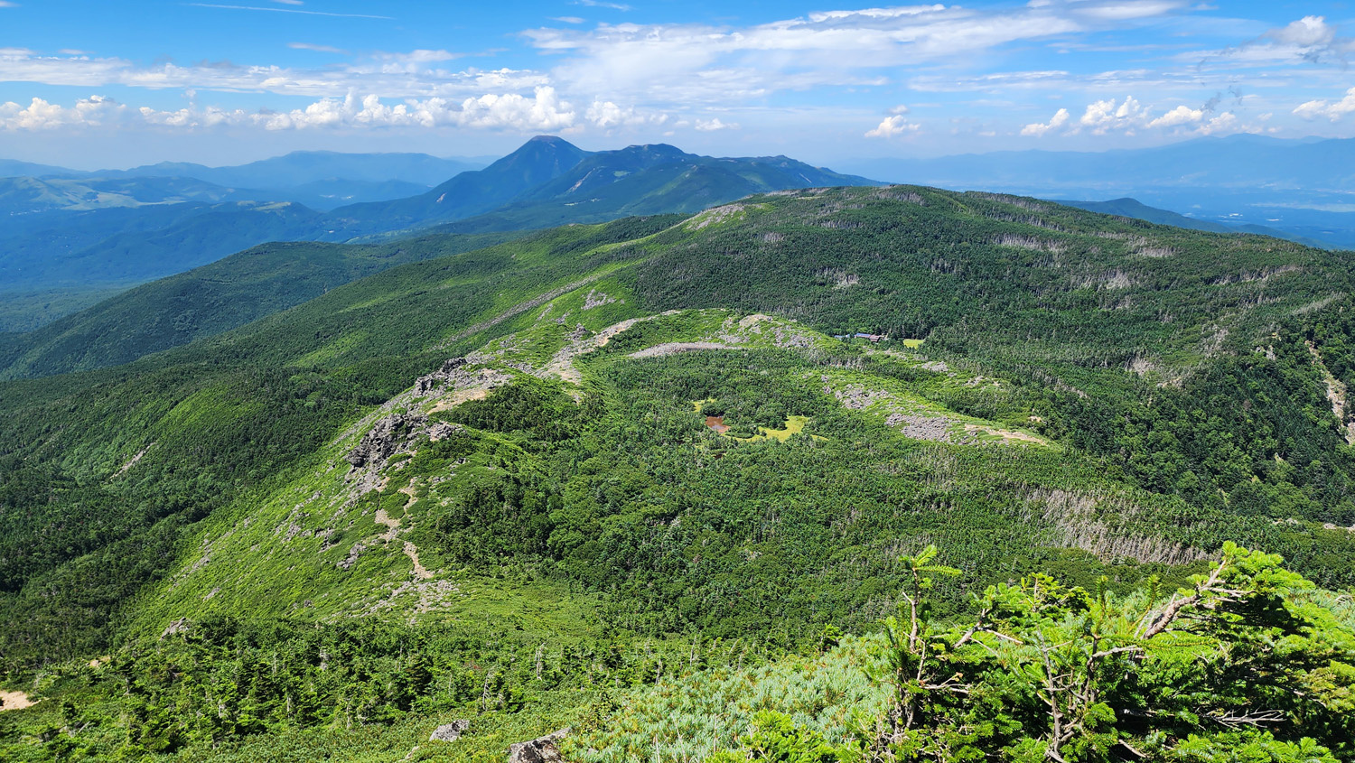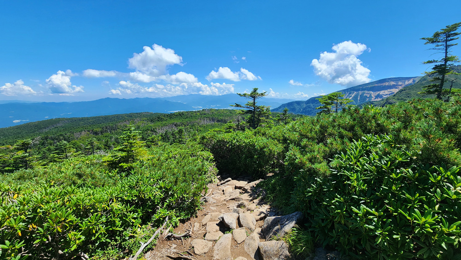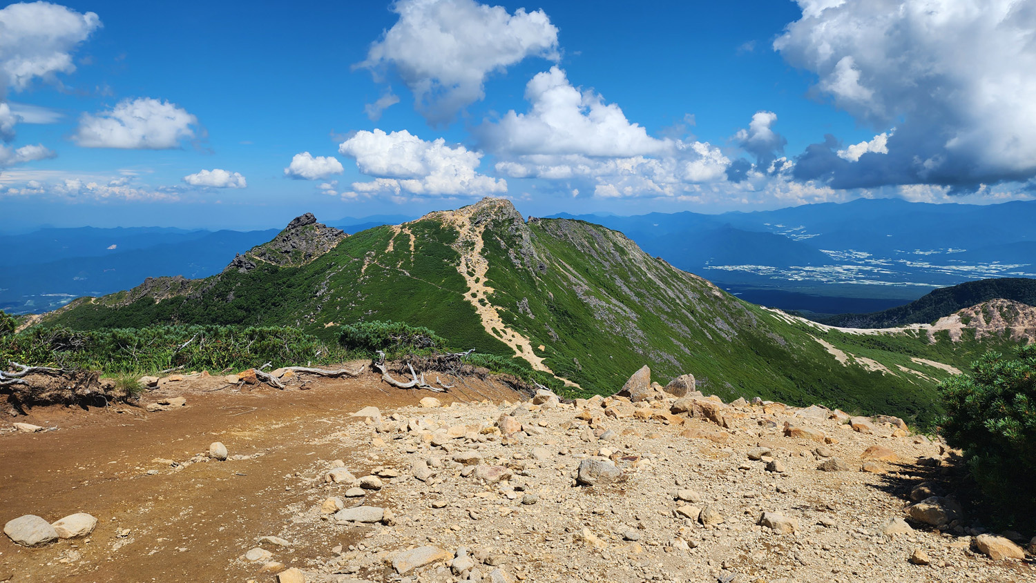 東天狗岳の少し手前で歩いてきた道を振り返る。いい景色。遠くに蓼科山とかが見えますね。