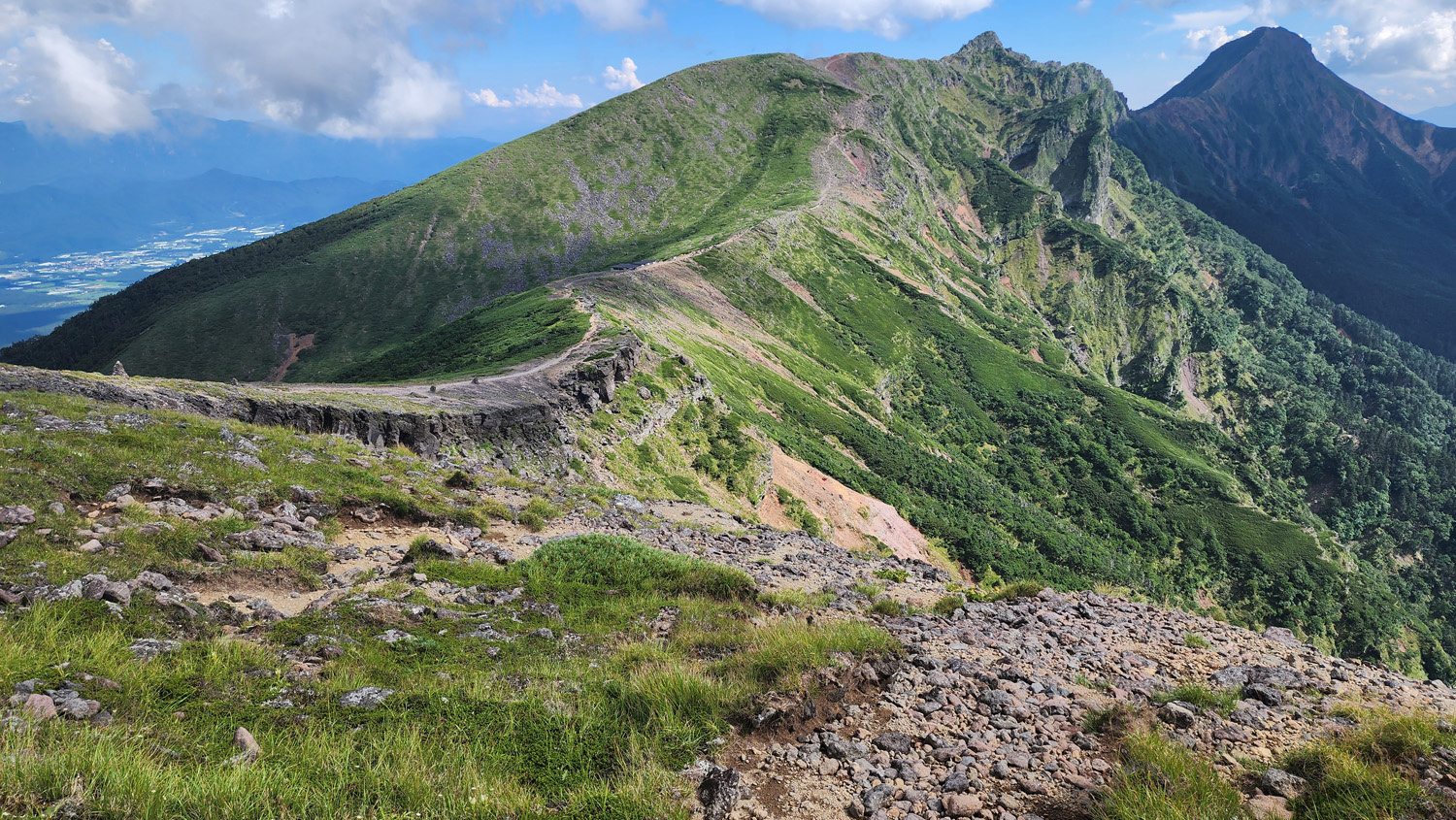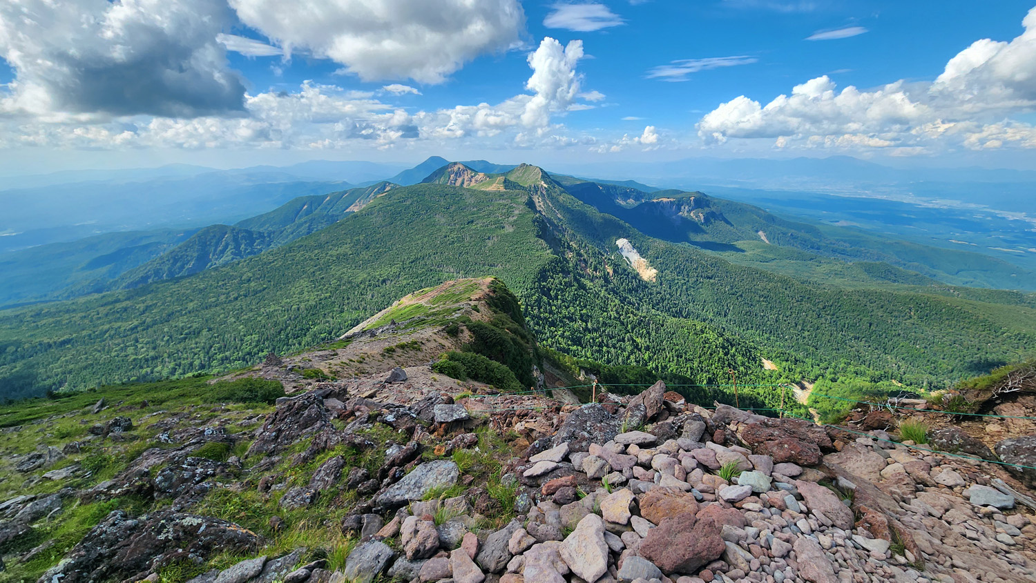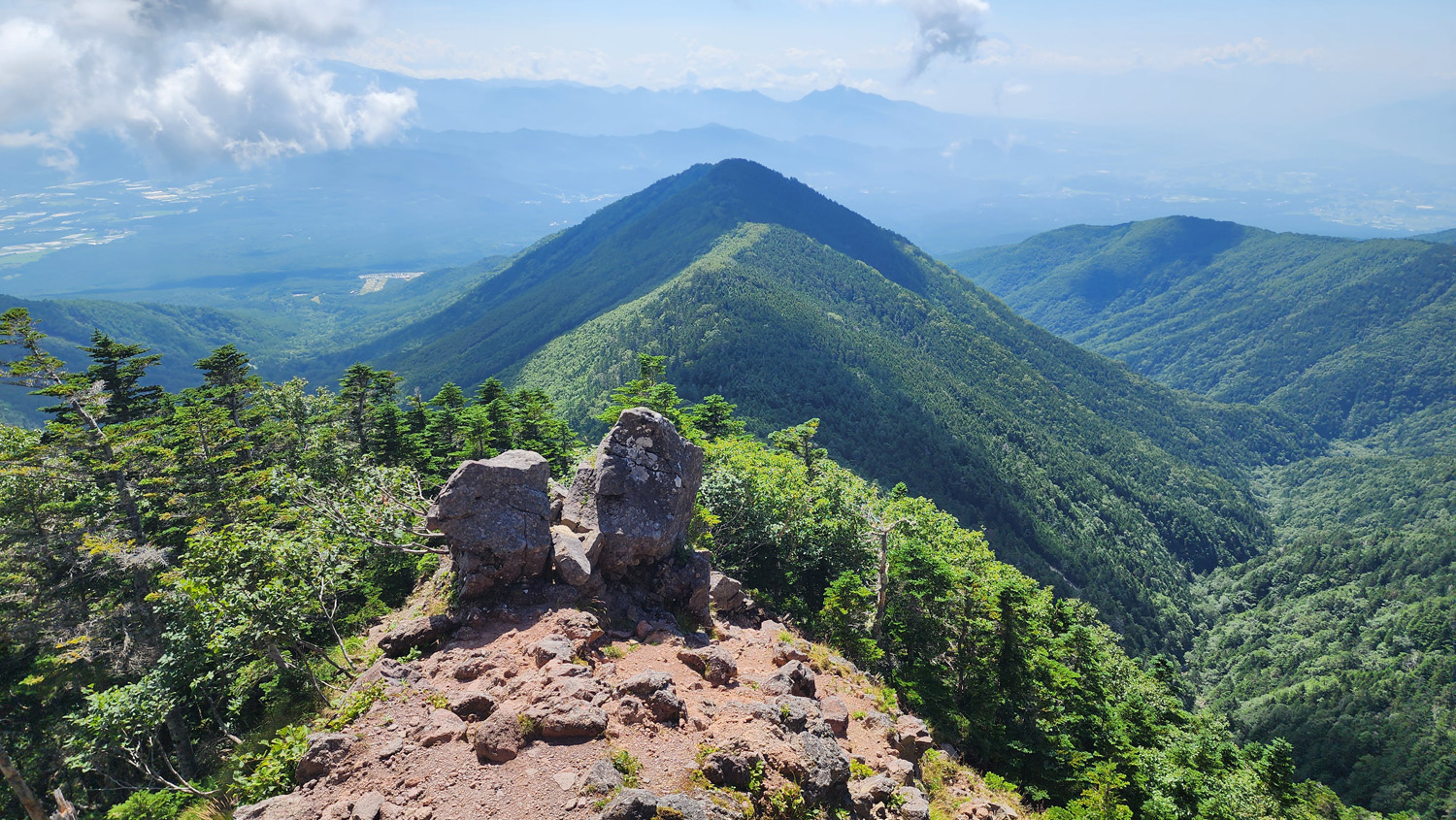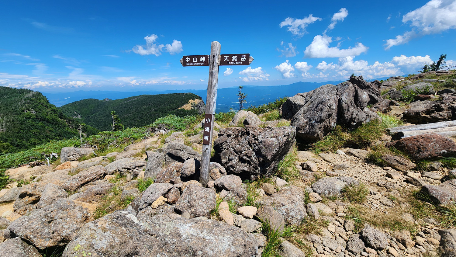東天狗岳の少し手前で歩いてきた道を振り返る。いい景色。遠くに蓼科山とかが見えますね。