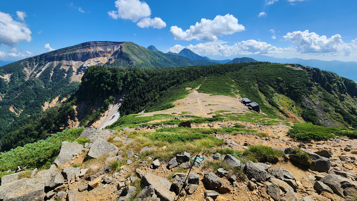 13時40分 根石岳(標高:2,603m)到着。鞍部に根石岳山荘が見えます。