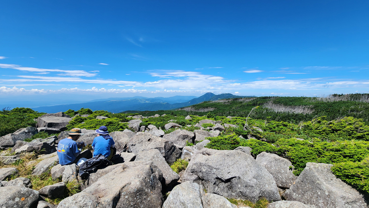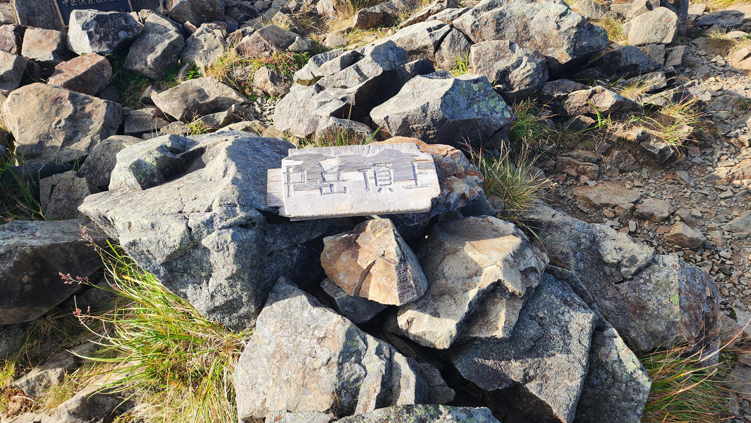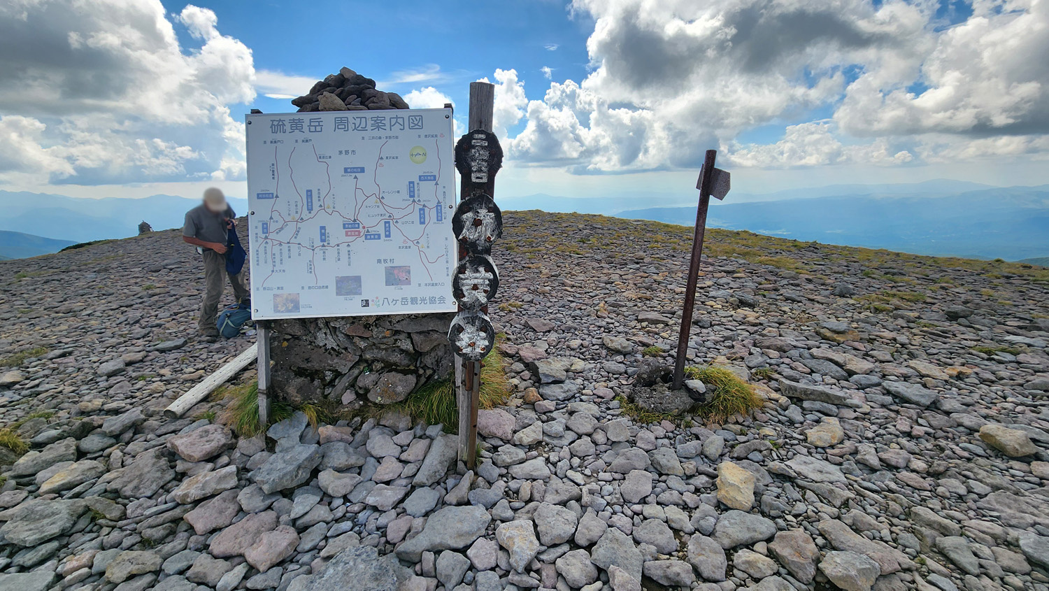 14時40分 硫黄岳(標高:2,760m)到着 山頂はだだっ広い岩の平場です。