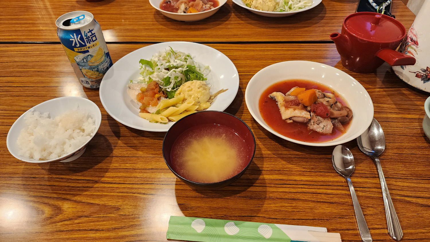 18時30分 夕飯の時間になったので、山荘の食堂へ(宿泊者が多かったので、夕飯は交代制)。こちらが硫黄岳山荘の夕飯(アルコール飲料などは別料金です)。ごはんと味噌汁はお代わり自由。味噌汁で使っている味噌は自家製みたいです。ごはんは当然おかわりしておいしくいただきました。