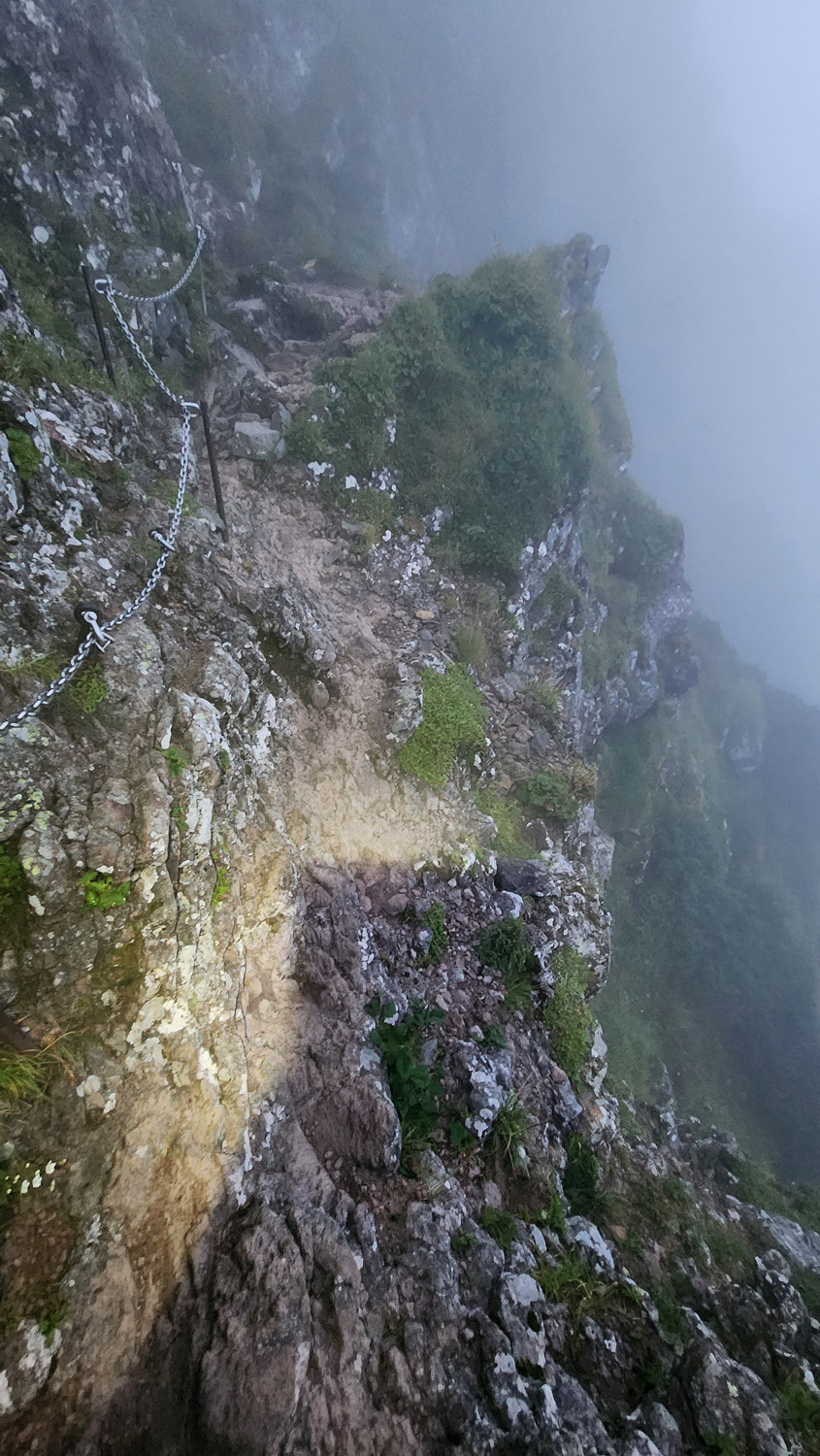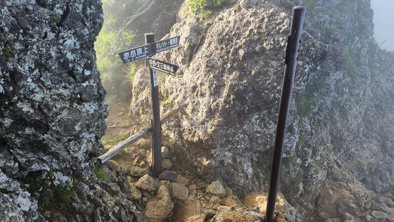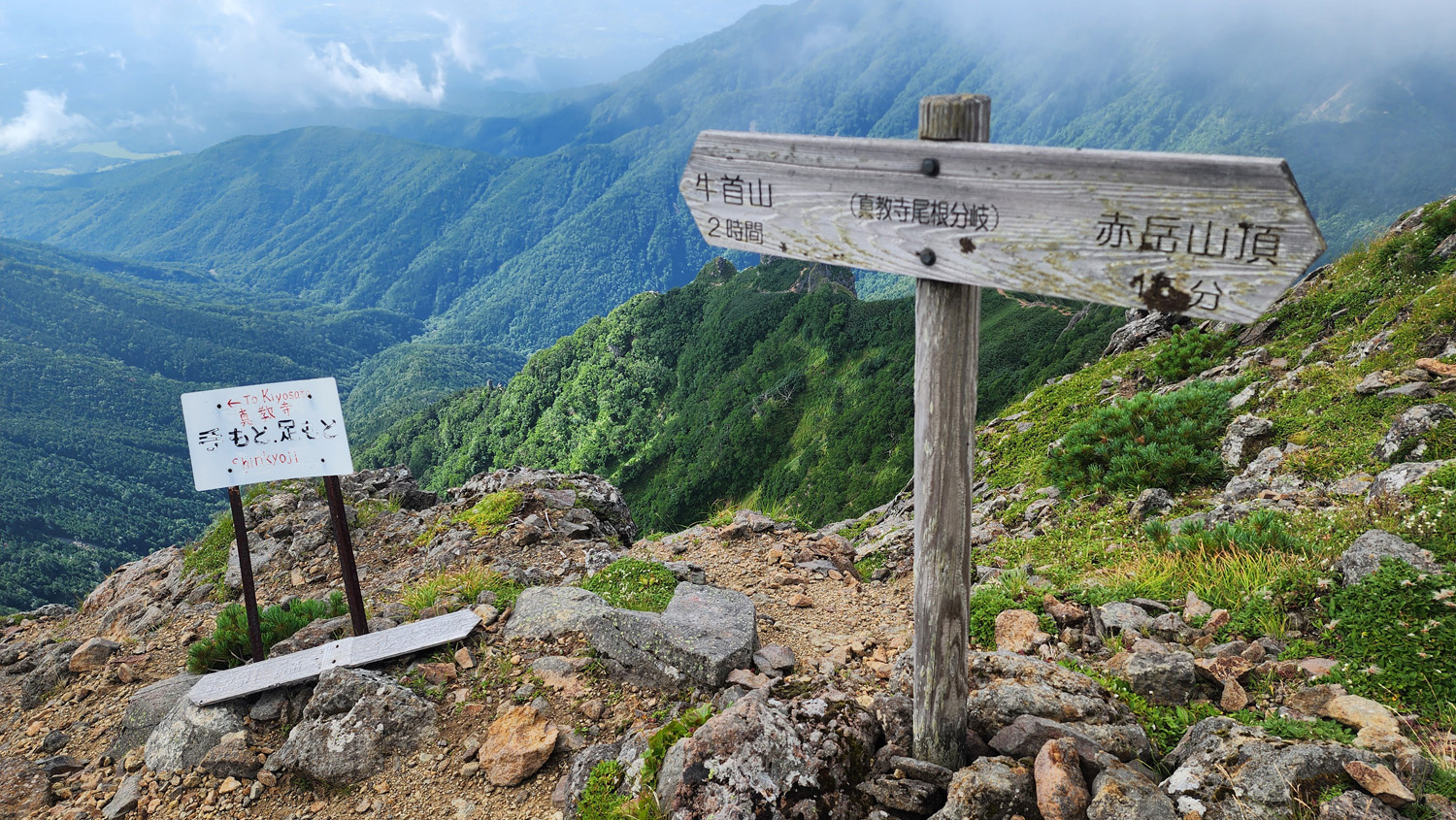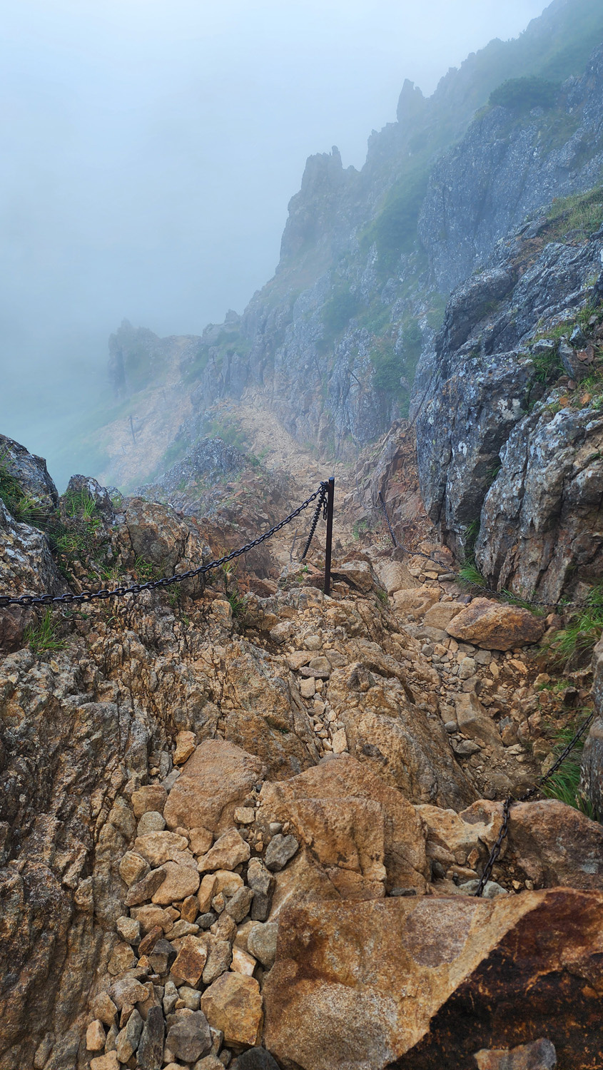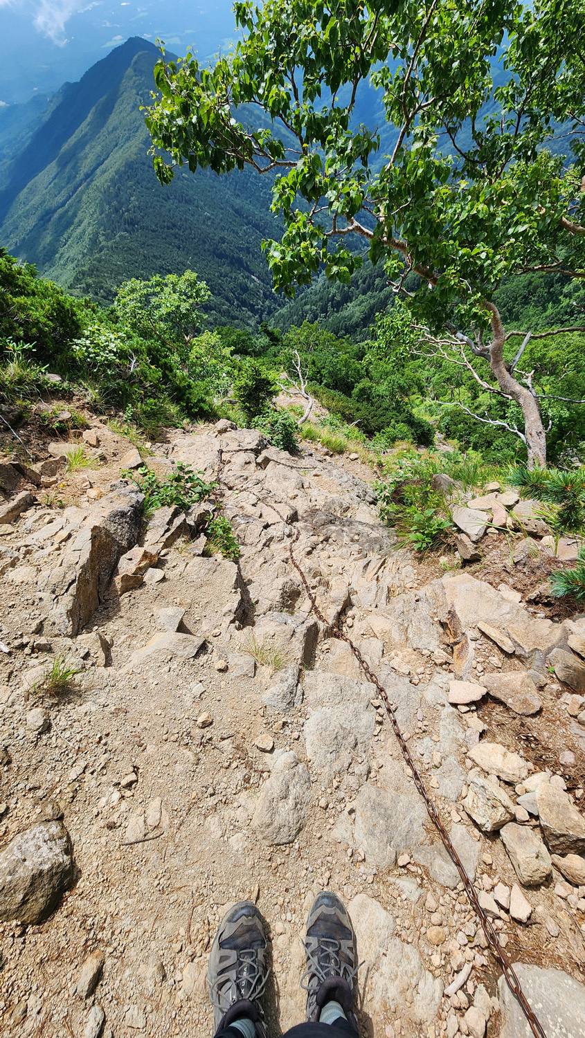 鎖場の難易度的には県界尾根のほうがやや上。真教寺尾根のほうが手がかり足がかりは見つけやすいから三点支持は取りやすい。ただ高度感は真教寺尾根のほうが感じやすいから高所恐怖症の私には結局どっちの下りも苦手。どっちも上りで使ったことないけど、上りだけだったらそんなに難しいルートではない気がする。