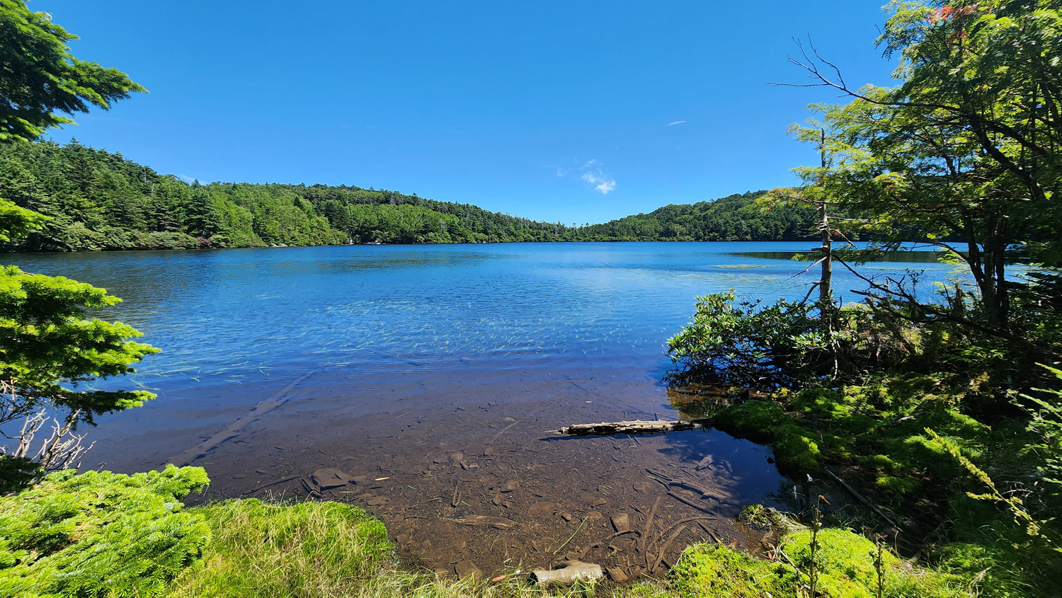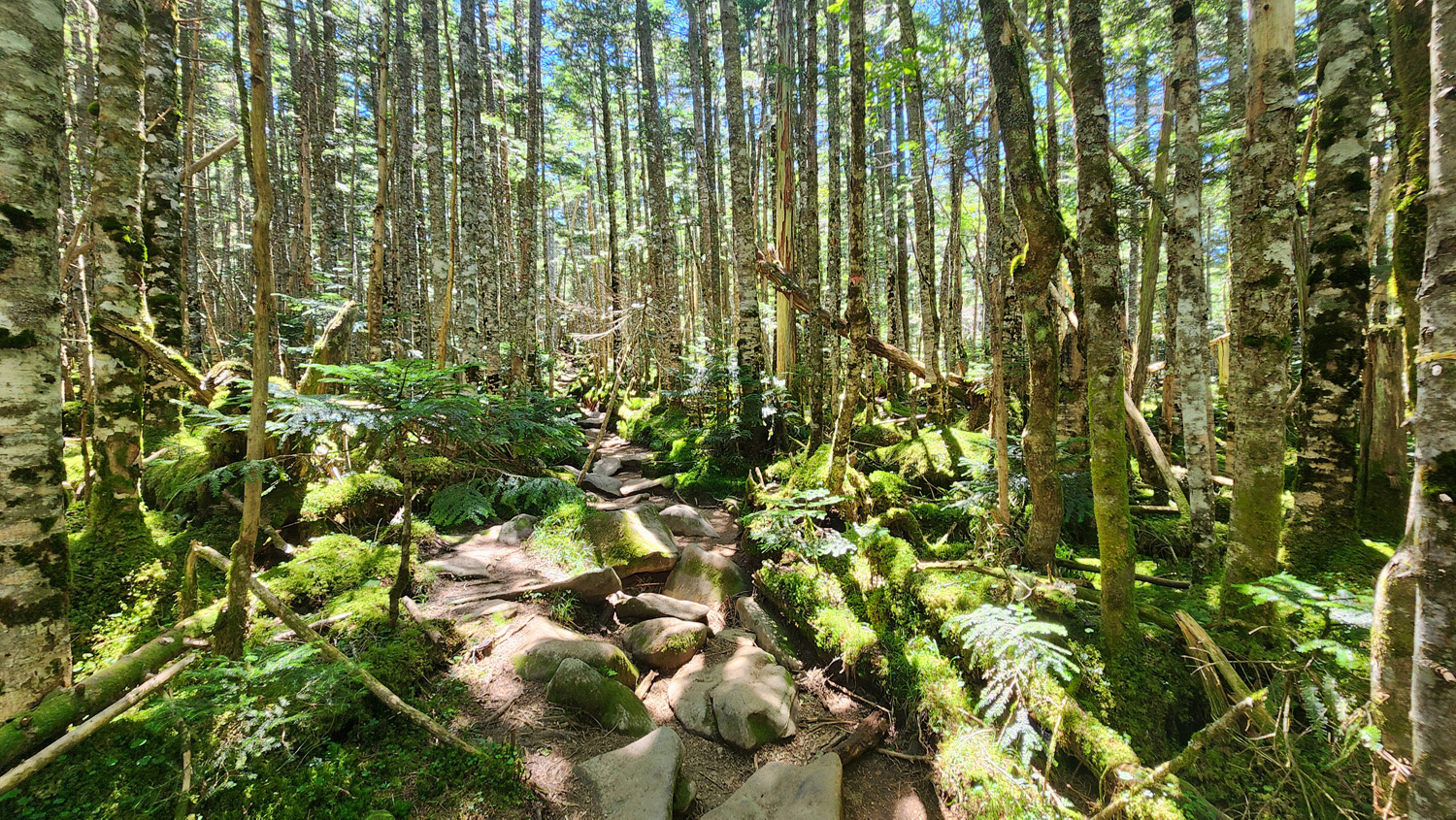 北八ヶ岳と言えば苔の森ということで苔を目で楽しみつつ樹林帯の中を進んでいきます。それにしてもスタートの白駒の池の時点で標高が2,115mあり、樹林帯の中ということで直射日光も遮ってくれて涼しい。しかもトンボがけっこう飛んでいて、そのおかげか不快な虫にまとわりつかれることもなく快適に歩けました。北ヤツ最高!