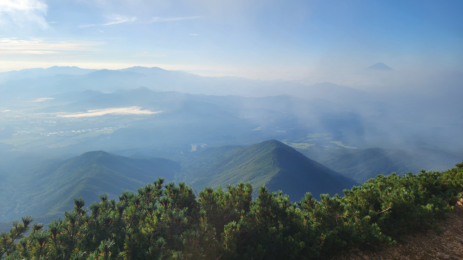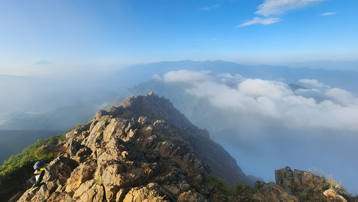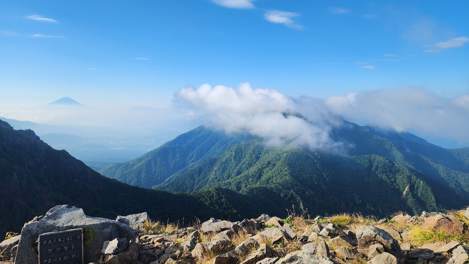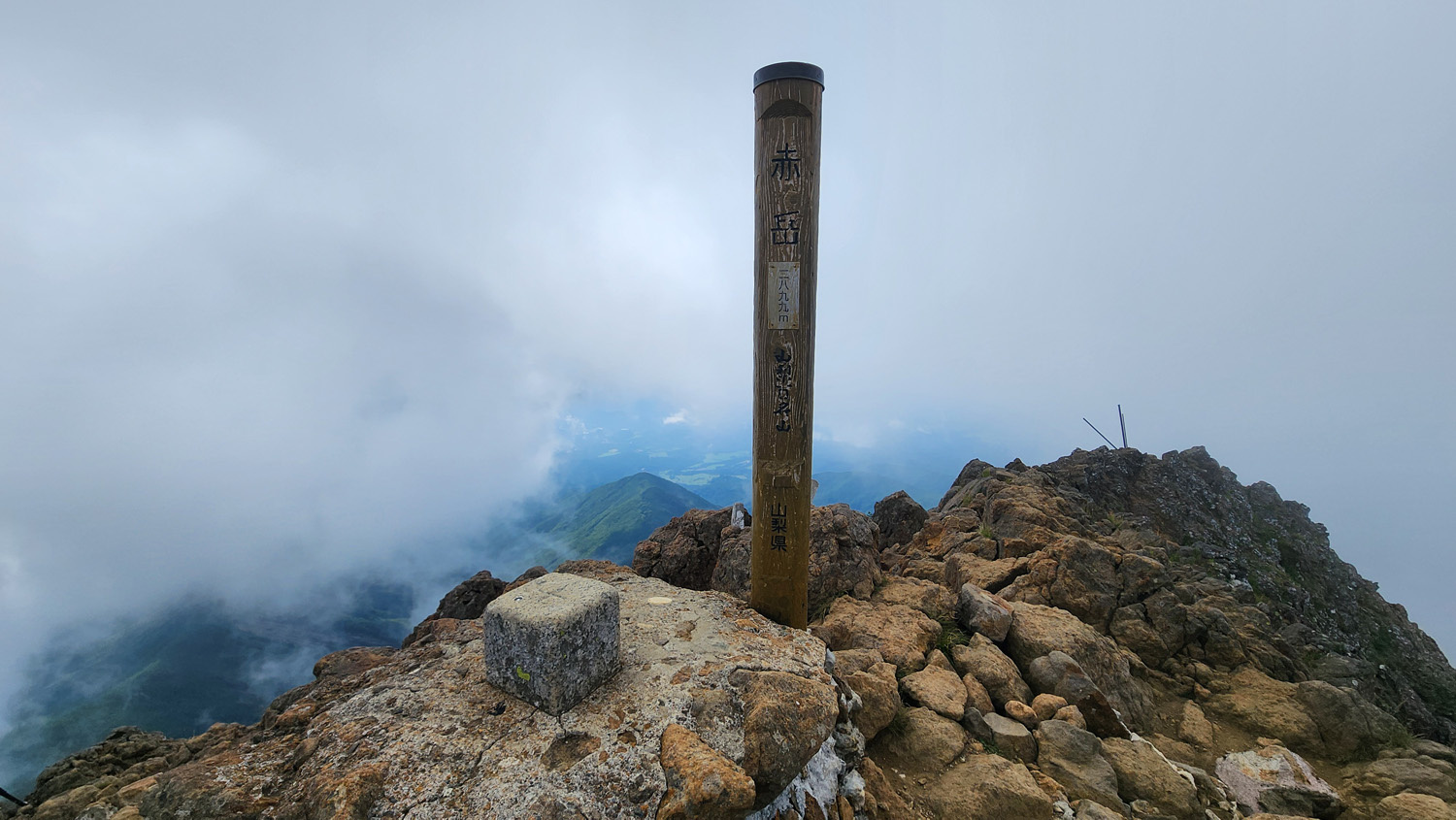 赤岳山頂から南方面の景色。雲で隠れてしまっていますが権現岳などの南八ヶ岳の山に加えて遠くに富士山や南アルプスの山などが見えます。