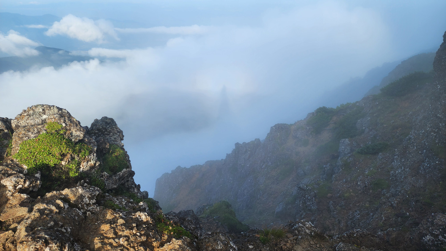 赤岳山頂で小休憩した後、中岳に向けて歩いていたら、うっすらですが、ブロッケン現象。