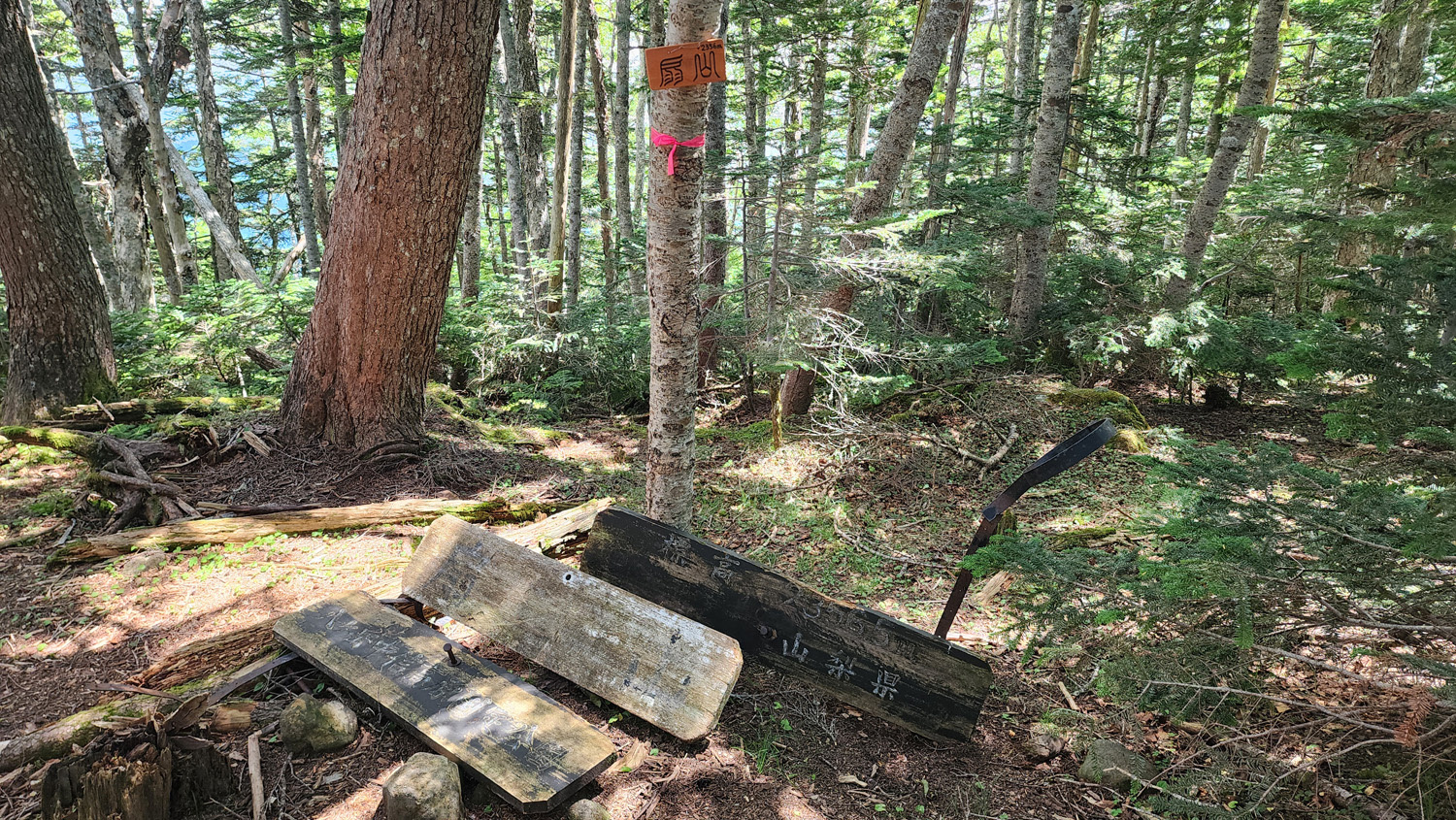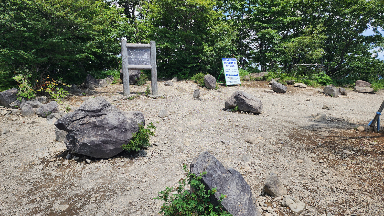 12時20分 美し森山(標高:1,542m)到着。ここまでずっと笹だらけのところを歩いてきたので、一旦登山靴を脱いで靴の中に入った草やら枝やらを取り払う。登山道は一旦ここで終了です。