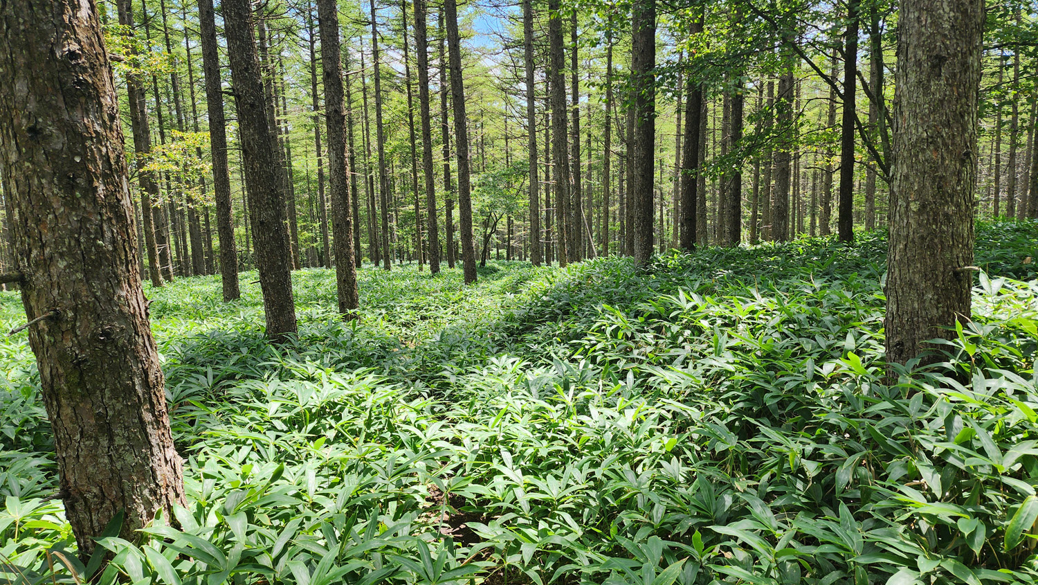 清里テラスから再度登山道復帰して下りていきますが、美し森山まではずっとこんな感じの笹てんこ盛りルート。足元が見えないくらい生い茂っているので、段差とか窪みに要注意です。あと、早朝とかだと朝露でびしょ濡れになりそうなのでレインウェア着たほうが良いかもしれません。
